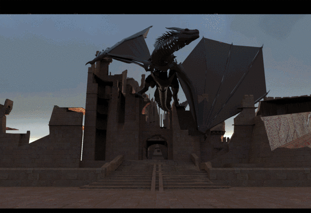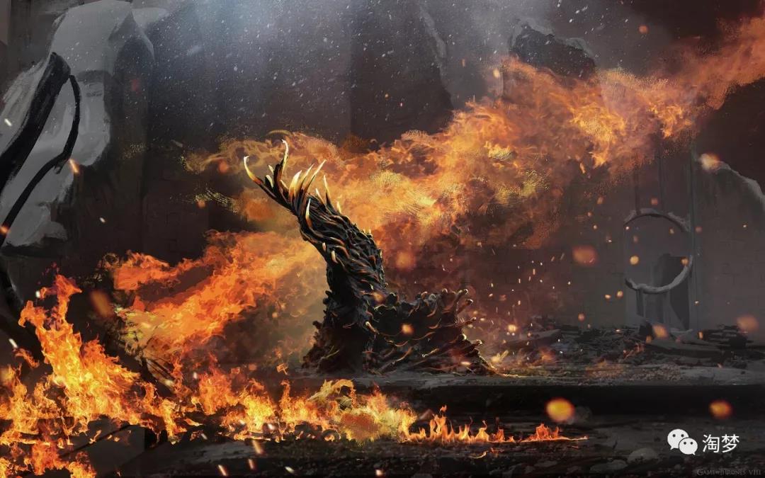 这个概念花了很长时间,这里的景色需要你能想到的一切——丹妮莉丝从台阶上往下望去,那是破败的大门、红堡外墙的废墟、烟和雪、灰烬降落在火堆上......一张图片中包含了很多东西,让人感觉丹妮莉丝俯视着这座城,她看起来强大而有统治力,是一个胜利的征服者!